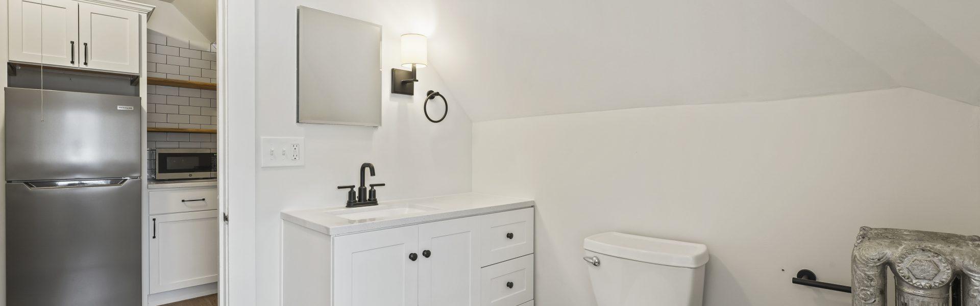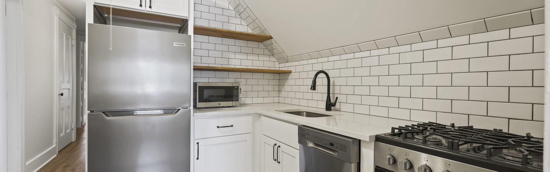 Gorgeous 900 ft² unit with generous creative living space, featuring a crisp white all-new bathroom with a full-size subway tile shower, and a compact brand-new kitchen with stone countertops, stainless steel appliances, white soft-close cabinetry, and custom-built floating shelves. The unit boasts hard flooring throughout and includes a versatile bonus multi-use room and office space for additional living or recreational needs, enhancing the functionality and comfort of this stylish home.